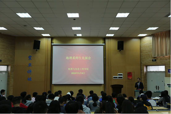 2019年5月8日中午12:30,金沙js4399首页地理系师生见面会在教三楼109举行。金沙js4399首页党委书记许德华,院长王绍强,副书记武彦斌,副院长刘修国、关庆锋、潘雄,院长助理尚建嘎、王伦澈;地球科学学院党委副书记张晓红;公共管理学院党委副书记刘国华;以及三个学院的部分老师和地理系全体学生参加了此次会议。