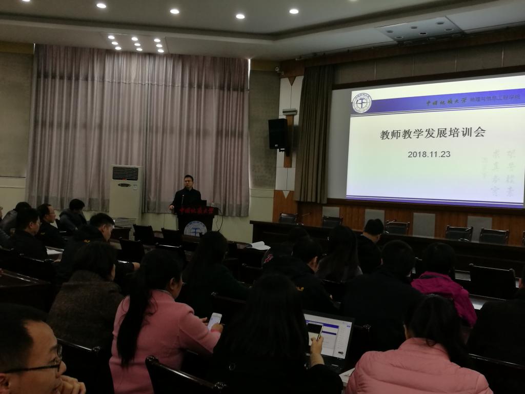 2018年11月23日下午2:30,信息工程学院教师教育发展培训会在八角楼召开,我院工程类专业全体教职工(软件工程、遥感科学与技术、测绘工程、地理空间信息工程)以及地理信息科学系主任参加了此次培训。