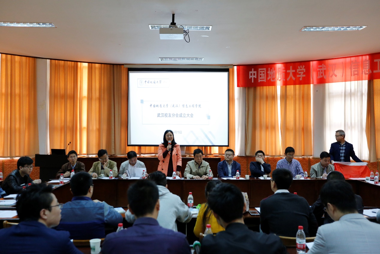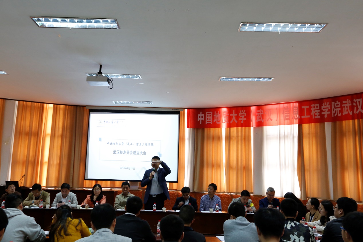2018年4月15日上午,中国地质大学(武汉)信息工程学院武汉校友分会成立大会在学校东苑会议室隆重举行。中国地质大学(武汉)校友与社会合作处处长徐岩,信息工程学院党委书记黄菊、信息工程学院院长谢忠、副院长刘修国、潘雄、软件工程系主任尚建嘎、地理信息科学系主任胡楚丽、遥感科学与技术系刘福江、学院办公室主任逄礴、学工组全体老师及武汉校友50余人出席成立大会。大会由信息工程学院党委副书记许德华主持。