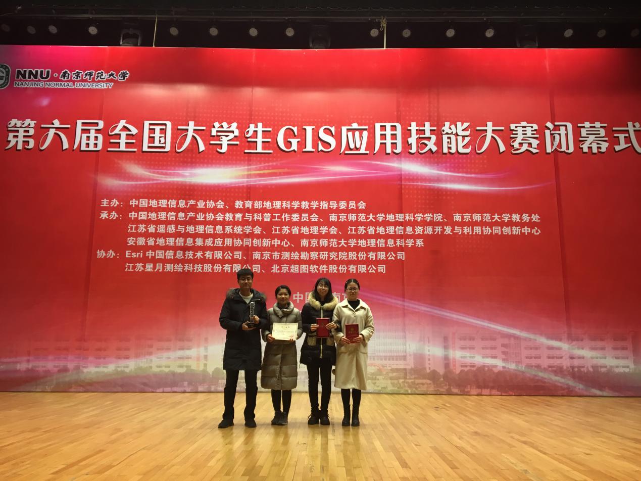 2017128日,由信工学院晁怡、祁昆仑老师指导,林欣、范雯、郭北阳、刘一飞同学组成的中国地质大学(武汉)代表队在江苏南京参加第六届全国大学生GIS应用技能大赛,获得一等奖。