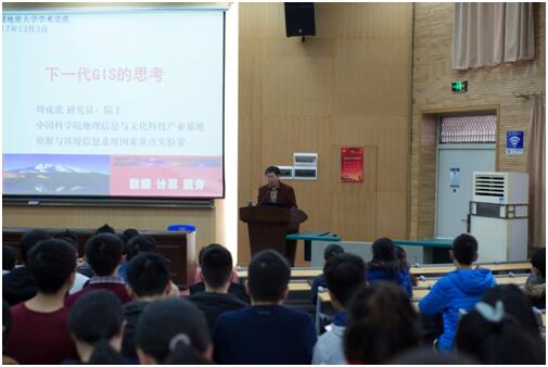 2017年12月3日上午十点,应中国地质大学(武汉)王焰新校长邀请,中国科学院周成虎院士在教三楼109报告厅为我院师生做题为“下一代GIS的思考”的学术报告。报告由信息工程学院院长谢忠主持,参加此次报告的还有刘修国、郑贵洲、尚建嘎、陈启浩、高伟、胡楚丽等老师以及信息工程学院的研究生和本科生。