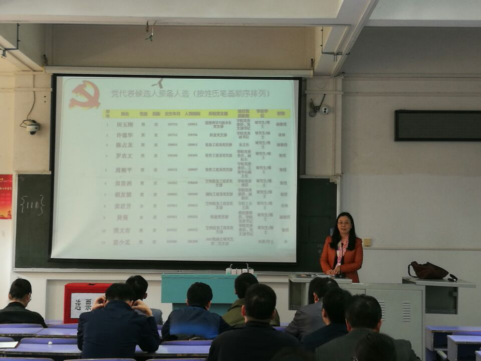 会议伊始,黄老师介绍了本次大会的主要议题,向学院党员介绍了田玉刚等11位党代表候选人。候选人中,唯一的一位学生党员叫霍少孟,2016年本科毕业于信息工程学院信息工程系,毕业后在江西赣州支教一年,并荣获江西省“优秀党员”称号,现为我院2017级硕士研究生。