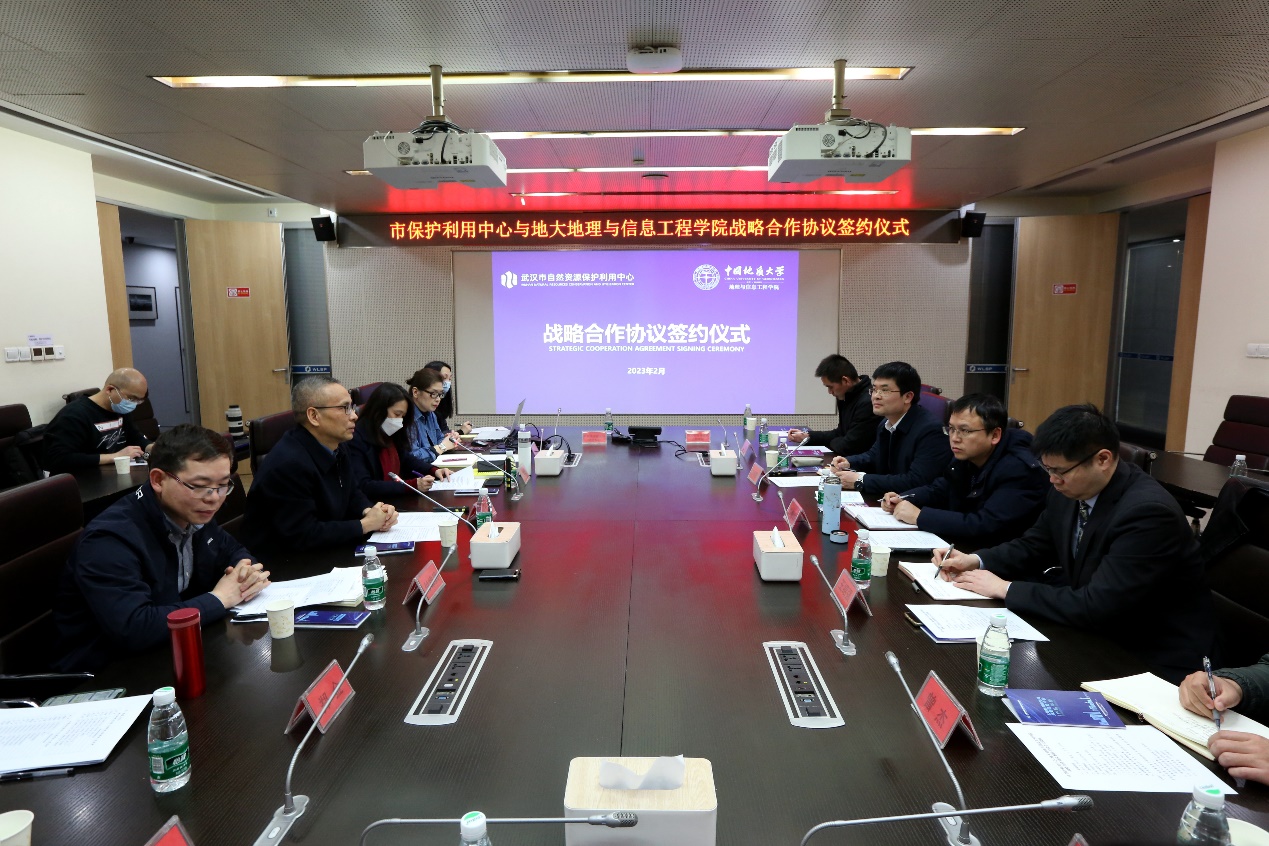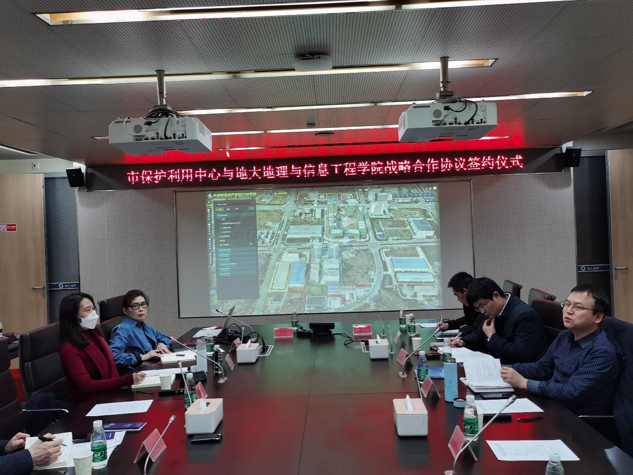 2023年2月24日下午,金沙js4399首页党委书记许德华、院长王绍强、副院长宋小青、学科与社会合作办公室主任曾杰、地理科学系副主任陈万旭以及教师代表赵国松一行,赴武汉市自然资源保护利用中心(简称“市保护利用中心”)开展访企拓岗促进协同育人战略合作交流。会议由“市保护利用中心”副主任亢德芝主持,“市保护利用中心”主任郑振华、技术管理部部长张翼峰、信息部部长付雄武、政策法规研究部部长王文静、土地利用研究部部长熊威、土地利用规划部部长徐桢敏、空间规划研究部部长彭阳、空间规划设计部部长何浩、江南分中心部长柳应飞等参加调研交流。
