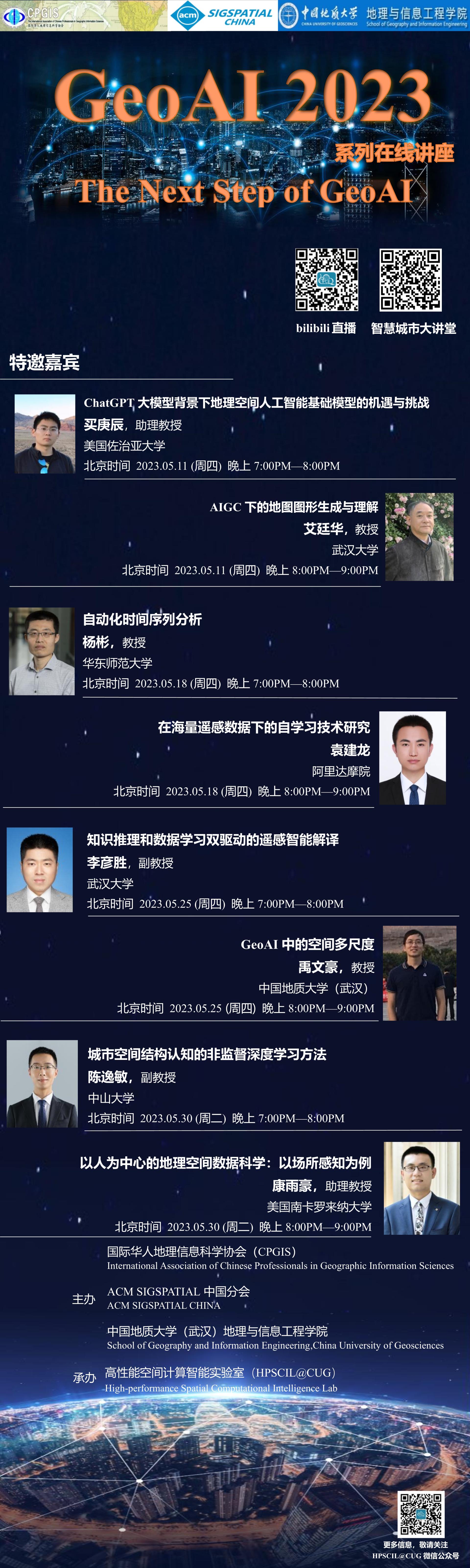 GeoAI 2023系列在线讲座,将于2023年5月11日至5月30日举行。本系列讲座由国际华人地理信息科学协会(CPGIS)、ACM SIGSPATIAL中国分会、金沙js4399首页联合主办,由高性能空间计算智能实验室(HPSCIL@CUG)承办。