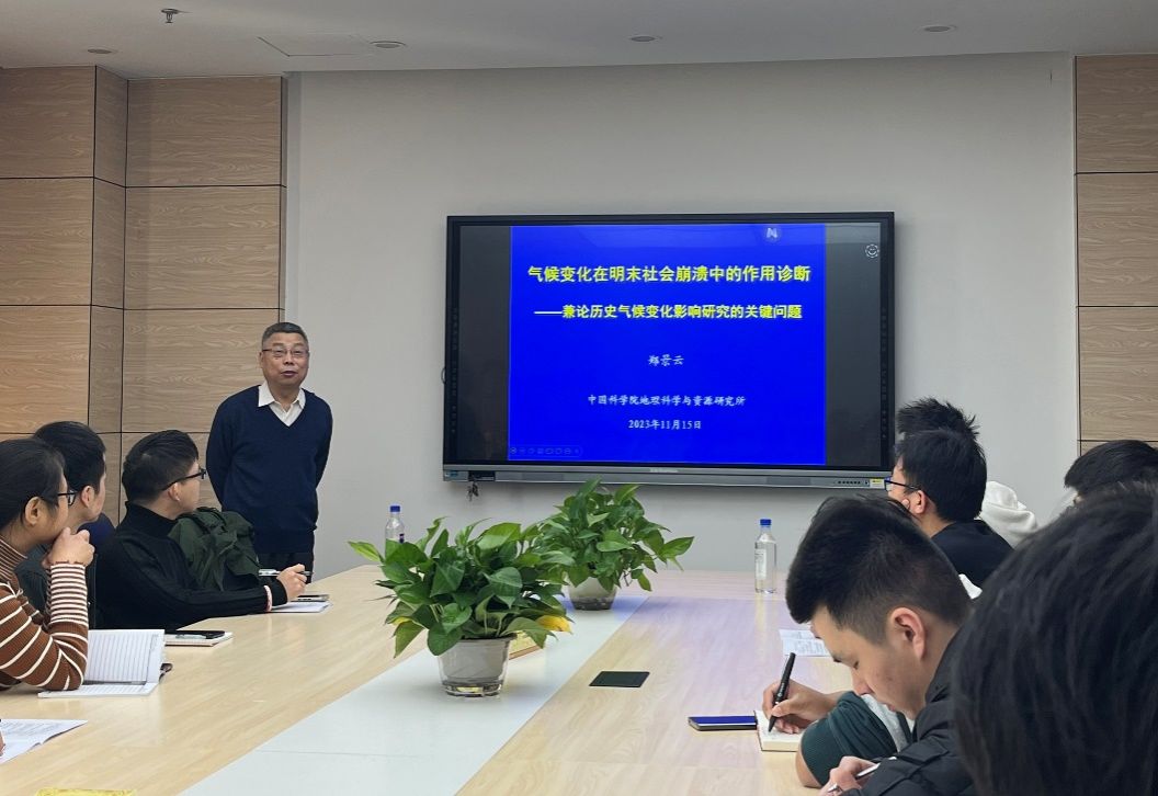 2023年11月17日,应我院胡超涌教授邀请,中国科学院地理科学与资源研究所郑景云研究员来我校交流,并在405会议室作题为“气候变化在明末社会崩溃中的作用诊断——兼论历史气候变化影响研究的关键问题”的学术报告,报告由胡超涌教授主持。