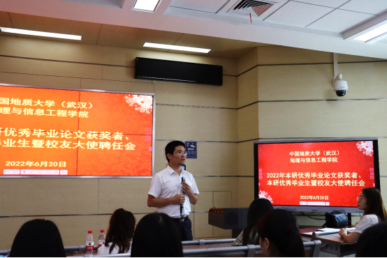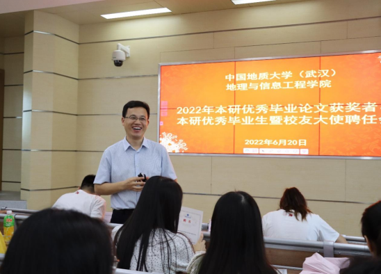 2022年6月20日,金沙js4399首页在中国地质大学(武汉)未来城校区公教一109教室召开院优秀毕业论文获得者、优秀毕业生暨校友大使聘任会。学院党委副书记武彦斌、副院长宋小青,学生工作办公室赵晓振主任、穆巴热克老师,教学与发展办公室教学管理助理孙慧敏,以及优秀毕业论文获得者、优秀毕业生和校友大使共计80余人参加会议。