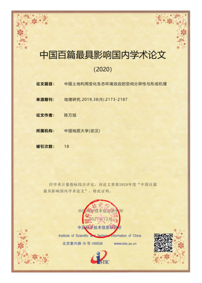 近日,我院陈万旭副教授等撰写的论文《中国土地利用变化生态环境效应的空间分异性与形成机理》获得来自中国科学技术信息研究所颁发的《中国百篇最具影响国内学术论文(2020)》证书,这是国内期刊论文的最高荣誉。