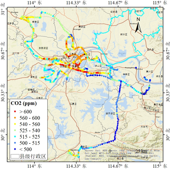 大气污染走航观测旨在获取不同季节、不同时段在走航路径上的观测数据,以绘制武汉城市群的大气CO2浓度的季节变化和空间变化图像。本次走航主要针对武汉城市群的冬季CO2和PM2.5浓度进行了强化观测,观测区域覆盖武汉二环线和三环线以及周边工业区,对武汉城市群周边城市如黄冈、孝感、咸宁等也进行了有针对性的走航观测。