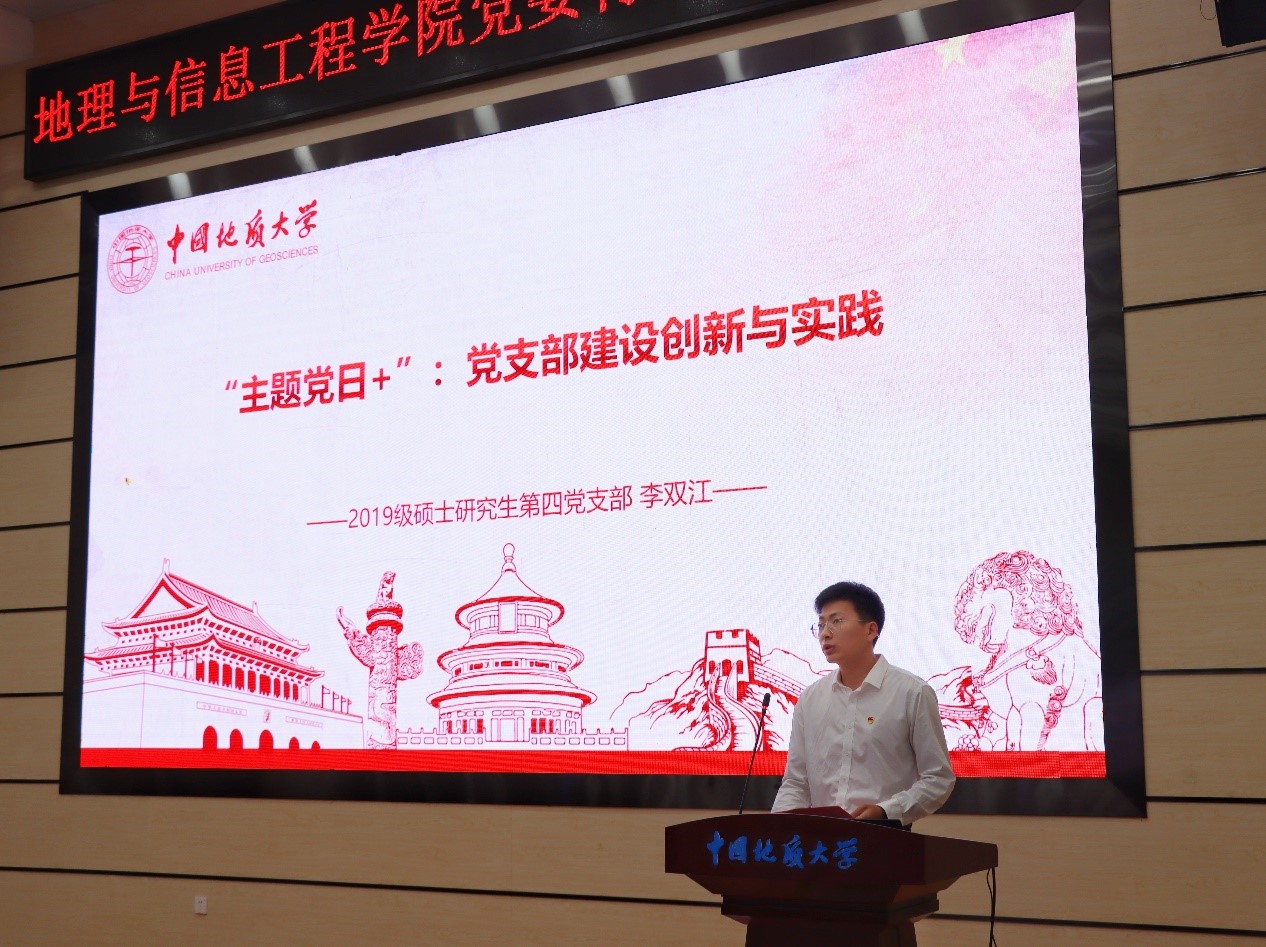 我院2019级硕士研究生第四党支部书记李双江以“主题党日+:党支部建设创新与实践”一题做分享,从支部思想建设,创新形式等方面做经验交流。