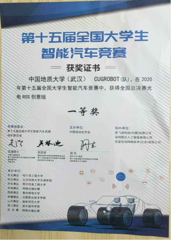 2020年8月23日至26日,第十五届全国大学生智能汽车竞赛创意组总决赛在南京信息工程大学举行,由金沙js4399首页学生组成的CUGROBOT团队(队员:莫惠南、江严钊、舒鹏杰、郑剑宇、李子宇,指导老师:罗忠文、刘袁缘)参加了创意ROS组的全国总决赛,获得全国一等奖。
