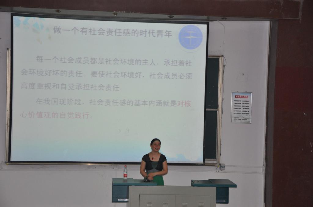 学院党委书记黄菊老师讲课,黄老师首先引用了习近平今年五四青年节在北京大学师生座谈会上的讲话“时间之河川流不息,每一代青年都有自己的际遇和机缘,都要在自己所处的时代条件下谋划人生、创造历史。”进而对全体毕业生指出,当代青年的历史责任,是做一个有社会责任感的时代青年。黄老师说,青年的价值取向决定了未来整个社会的价值取向,所以,同学们应该在将来的社会生活中主动践行社会主义核心价值观。青年践行社会主义核心价值观的过程,是励志的过程、修德的过程,也是更好地实现自己人生价值的过程。黄老师给大家详细地介绍了社会主义核心价值观的内涵,从公民层面的价值要求出发,告诉同学们要爱国、敬业、诚信、友善。具体的践行方式是勤学、修德、明辨、笃实。最后,黄老师用温家宝校友在2012年5月19日回母校时的讲话结束,希望全体毕业生铭记“母校培养了我,我要用我自己工作的成绩来报答母校,决不辜负母校对我的期望。”