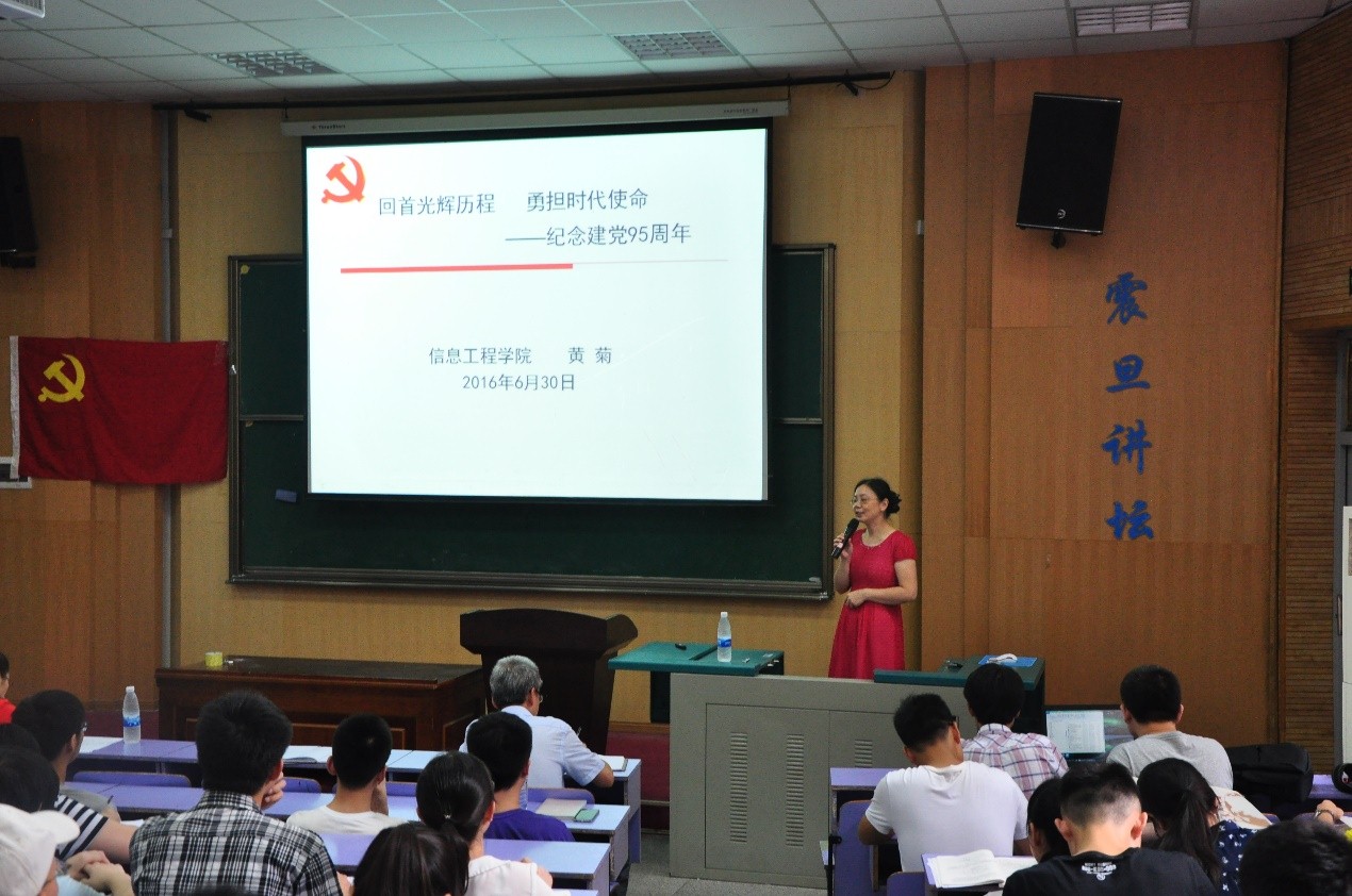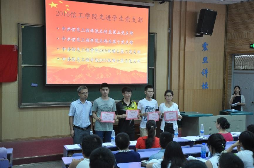 (通讯员:周宇)2016年6月30日下午,信息工程学院2016年“七一”表彰暨全体学生党员大会在教三110教室举行。在建党95周年之际,为表彰先进、加强学院学生党员教育,我院党委根据中国地质大学(武汉)《关于评选表彰先进本科生党支部和优秀本科生共产党员暨2015-2016年度“党徽照我行——支部引领工程”项目结题评选通知》及其他相关文件要求、结合学院实际情况,开展了此次“七一”表彰暨全体学生党员大会。 大会由信息工程学院学生党建办公室主任李雨竹老师主持,信息工程学院党委书记黄菊、党委副书记许德华、团委书记武彦斌、2013级辅导员王渊、2014级辅导员宋超以及信工学院全体学生党员参加。