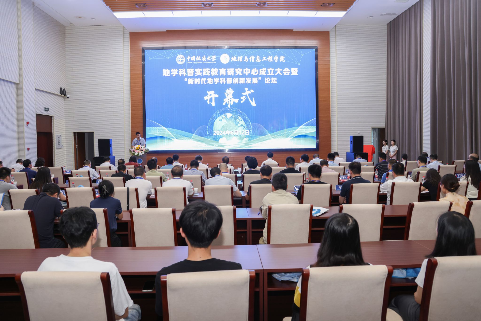 授牌仪式环节中,武汉市科协郑华副主席为学院授牌“武汉市科普教育基地”。学校党委副书记王林清为学院“地学科普实践教育研究中心”授牌。