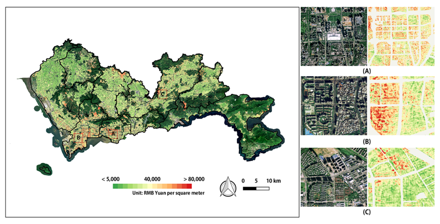 图3深圳市房价空间分布精细制图结果:(A) 福田区的深圳市民中心;(B) 南山区南头街道(深圳市关内和关外交界处);(C) 龙岗区中海地产