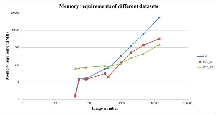 为了进一步解决大数据量带来的平差效率低下的问题,本文引入GPU并行计算技术,同时使用预条件共轭梯度法以及不精确牛顿解法求解区域网平差过程中的法方程,构建了适用于GPU并行计算的全新的区域网平差技术流程. 本方法避免了存储法方程系数矩阵,而是在需要的时候实时的计算该矩阵,使得本算法相较于传统的算法所需的计算机内存空间大幅减少(仅需要存储平差原始数据即可),平差计算速度明显提升,同时计算精度与传统方法相当。初步试验证明,本文的方法在普通电脑上仅需要约1.5分钟即可完成对4500张影像、近900万像点数据的平差计算,且计算精度达到子像素级。