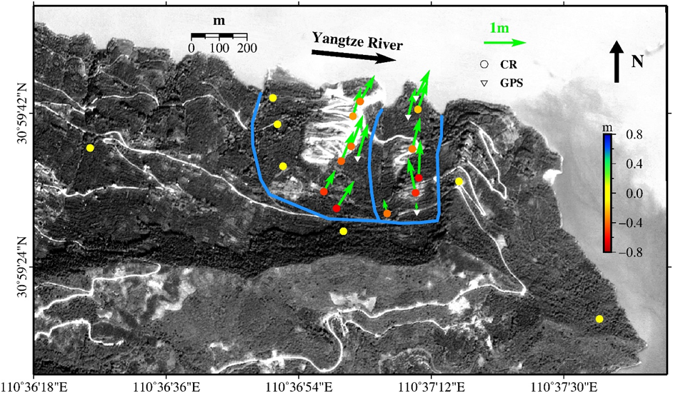 图1 树坪滑坡2009年2月-2010年5月累计变形,箭头表示水平方向位移,彩色点表示垂直方向位移。