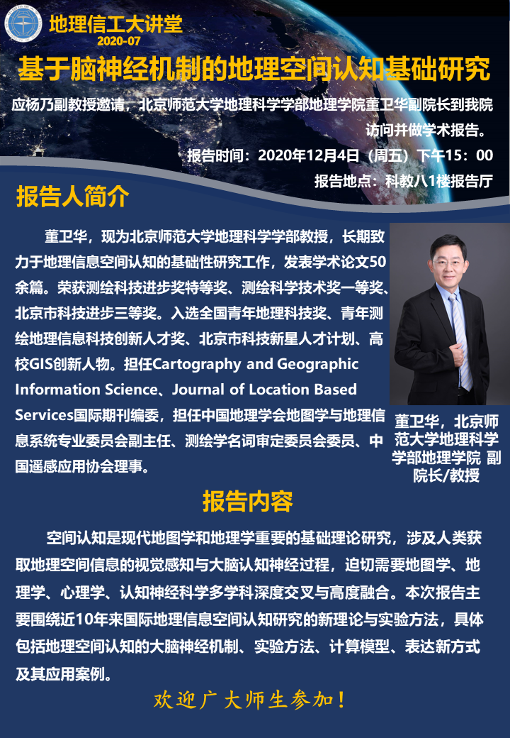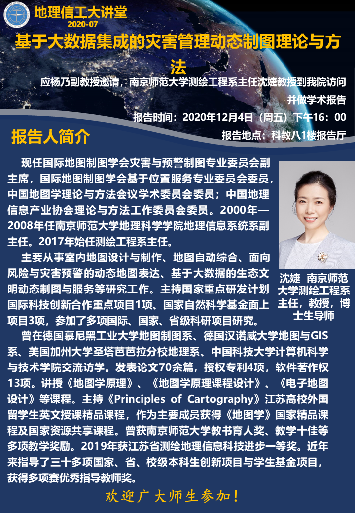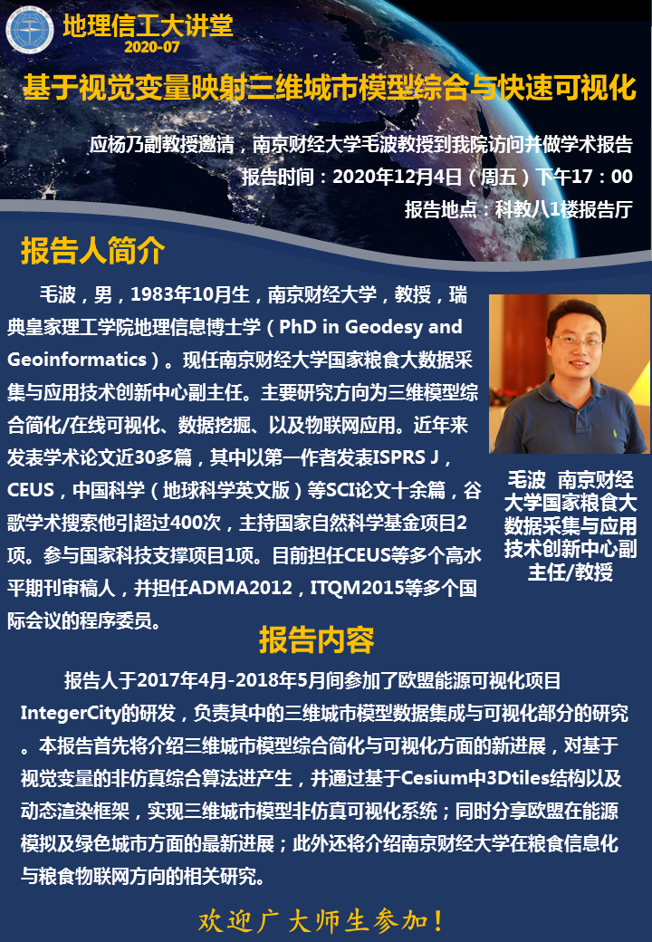 金沙js4399首页于2020年12月4日下午15点至18点主办地理空间可视化论坛。本论坛立足于时空大数据可视化需求,围绕地理空间认知、灾害动态制图、三维城市模型综合等前沿科学问题,邀请北京师范大学、南京师范大学、南京财经大学3位知名学者交流学术进展和科研成果,以扩大我校在国内地图学领域、地理信息科学领域的交流与合作。