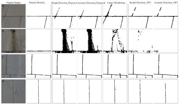 Figure 3. Four typical partial examples of expansion joint detection. Columns from left to right are the original images, manually drawn sketches, rough detection results using the proposed method, accurate detection results using the proposed method, detection results using the canny-morphology method, rough detection results using the SWT algorithm and accurate detection results using the SWT algorithm.