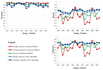 Figure 2. Detection accuracy for expansion joints of all images. And (a) is the Precision curves using the proposed method, the canny_morphology method, and the SWT Algorithm. (b) is the Recall curves using the proposed method, the canny_morphology method, and the SWT Algorithm. (c) is the F-measure curves of using the proposed method, the canny_morphology method, and the SWT Algorithm.