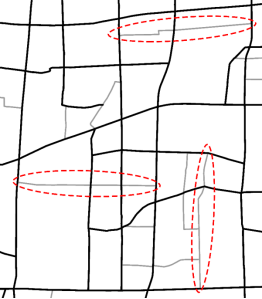 基于以上思想,接下来的问题便是如何量测弧段间的功能联系。本文通过引入交通大数据的出租车轨迹流,判断弧段间是否存在显著的交通流;若存在,则认为弧段间具有较强的功能联系(图1),在地图综合过程中,需同时保留或删除相应弧段,以最大程度还原真实场景下人们的路径选择(图2)。