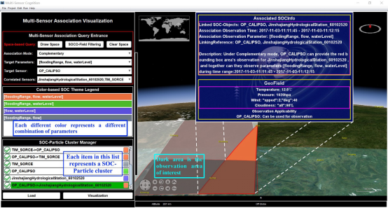面对一个特定的地学观测任务时,人们需要在尽可能短的时间内获取全面、可靠的灾害信息。然而由于人们未掌握当前多传感器及其关联观测能力,因此不能有效地规划传感器进行灾害信息感知。本成果采用GIS对象场作为底层框架,首次将其扩展到传感网观测建模中,创新地提出了传感器观测能力对象场(SOCO-Field: Sensor Observation Capability Object Field)模型(图1),并以观测能力粒子(SOC-Particle)作为它的核心;观测能力粒子可以聚集形成观测能力粒子簇(SOC-Particle Cluster),因此可以表征任意传感器组合的关联观测能力。SOCO-Field集成了传感器观测能力对象(SOC-Object)以及地理环境场(GeoField),实现了基于空间位置的传感器观测能力发现。此外,SOCO-Field设计了三种基本的关联模式(交、并、叉)以及四种深度的关联模式(互补、增强、竞争、协作),可以实现对传感器间观测能力的关联,同时考虑了动态地理环境对传感器理论观测能力的影响,从而求得传感器的实际有效观测能力。以金沙江下游的洪涝观测传感器发现作为实验,基于团队开发的Multi-Sensor Cognition原型系统,对SOCO-Field进行了建模以及验证,实验结果(图2)表明,SOCO-Field可以对多传感器关联观测能力进行有效表征,传感器查询人员可以查看以及认知任意传感器组合在特定关联模式下的关联观测能力,并以此作为传感器观测规划的信息依据,辅助对灾害作出多传感器规划的响应。