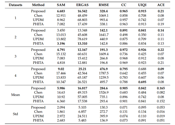在实验中,本文提出的方法与现有的高光谱影像模拟方法进行了对比,包含Chen,UPDM和PHITA。定量评价结果如表1所示。实验结果表明: