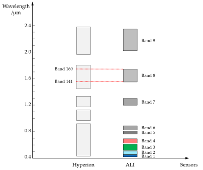 图3 高光谱影像与多光谱影像中波段的波长范围