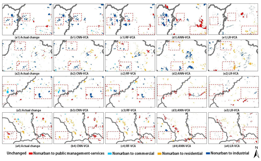 结果表明:与其它现有的VCA模型(如逻辑回归-VCA,人工神经网络-VCA和随机森林-VCA)相比,CNN-VCA模型实现了最高的模拟精度(FoM指数为0.361,景观相似度为0.948)。