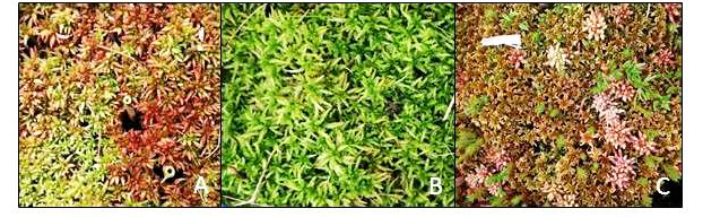 图2 泥炭地中优势种-泥炭藓(A-中位泥炭藓,B-大泥炭藓,C-锈色泥炭藓)
