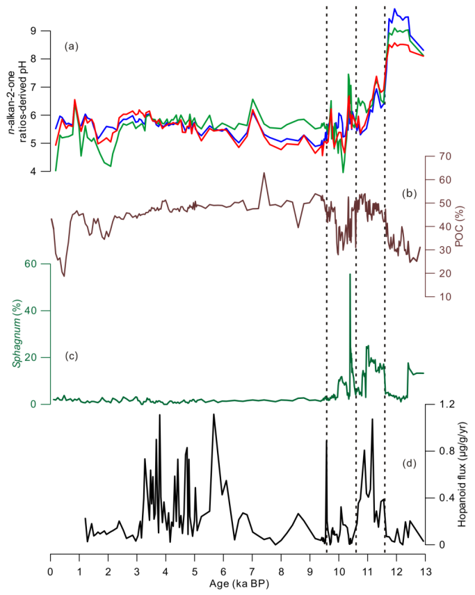 图2 脂肪酮指标重建的13ka以来的古pH变化,与泥炭总有机碳含量、泥炭藓孢子、藿类通量指示的干湿古水文变化的对比