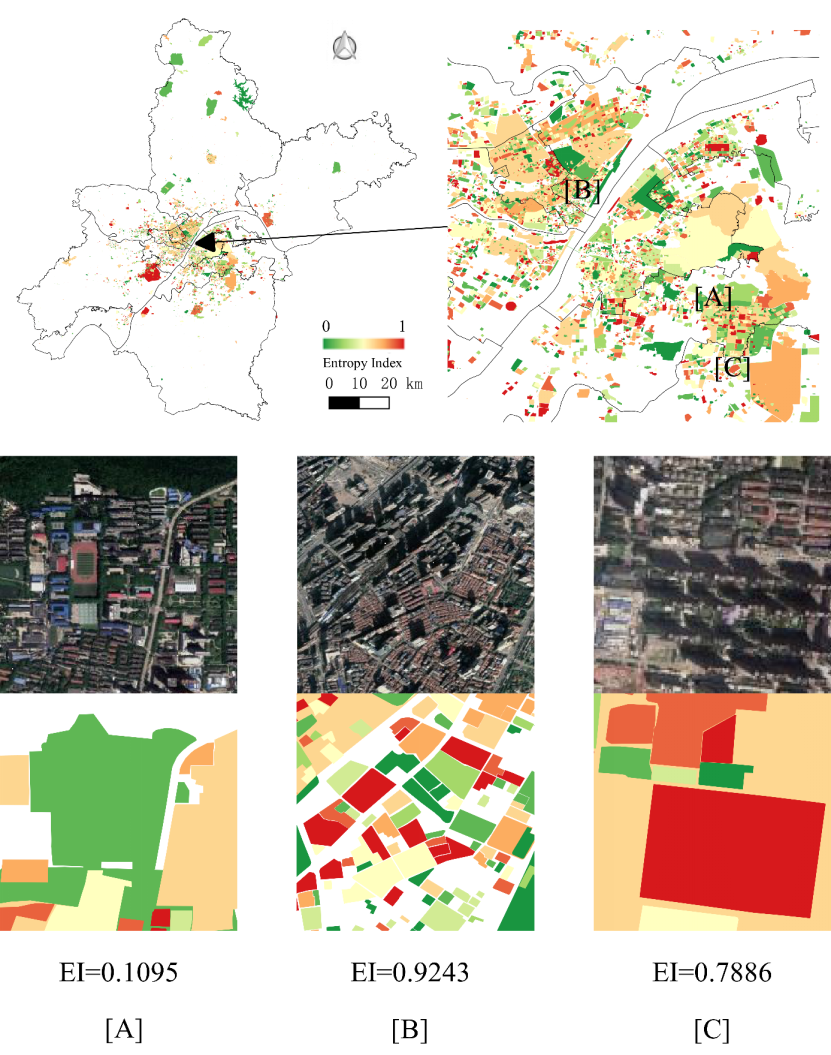 【图2 武汉市地块尺度的职住属性混合熵分布结果:(A)中国地质大学 (B)汉口江滩 (C)光谷软件园】