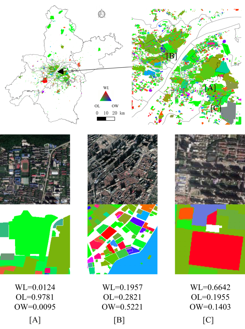 【图1 武汉市地块级尺度的职住属性空间分布拟合结果:(A)中国地质大学 (B)汉口江滩 (C)光谷软件园】