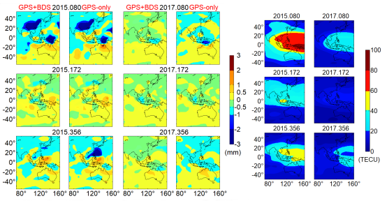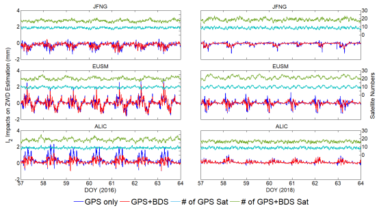 论文研究表明,二阶电离层延迟对估计ZWD的影响可超过3mm,采用GPS/BDS集成可以在一定程度上降低二阶电离层延迟的影响。但BDS系统的静止轨道卫星观测数据,因其信号受电离层最为活跃的赤道区域的影响,在电离层较为活跃的地方时中午时段,GPS/BDS集成可能会给ZWD评估带来更大的误差。