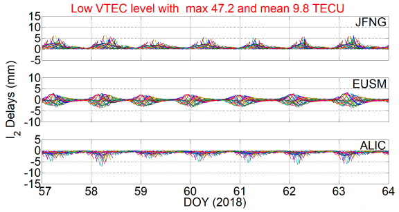 图1. 测站JFNG、EUSM和ALIC活跃期(上)和非活跃期(下)的二阶电离层延迟