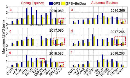 论文统计了2015年至2018年的二分二至日,二阶电离层延迟对ZWD影响的最大值,并且测站按纬度升序进行排序,结果如图3所示。高纬度测站的最大值小于低纬度测站的最大值。在大多数测站,GPS和BDS结合使用的影响要小于单独使用GPS。