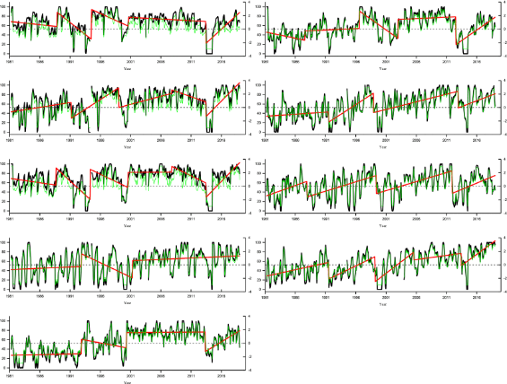 图3. 北寒带,北温带,北热带,南热带和南温带月序列和断点位置以及分段趋势,第二个Y轴用于异常值索引。