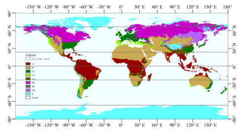 图1. 根据Köppen–Geiger地图重新分析的纬度范围和世界气候区