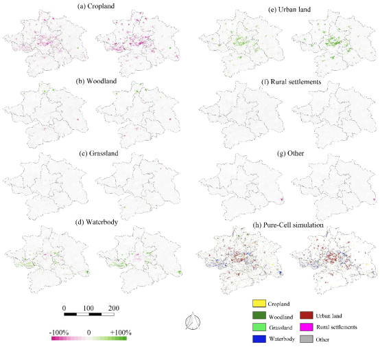 拟从三个方面开展对模拟结果的评价:1)从多维连续变量空间分布的角度评价混合元胞CA模型的模拟结果的整体精度,选择指标:亚像元混淆矩阵(SCM); 2)从元胞结构相似度的角度评价模拟结果在每个元胞上的个体精度,然后通过对所有元胞的个体精度的统计分析,对区域尺度的土地利用结构与真实结构的相似度展开评价,选择指标:相对熵(RE);3)混合元胞的变化精度,为此我们参考为纯质元胞设计的传统FoM指标的结构,提出一种新的适用于评价混合元胞变化精度的新指标(mcFoM)。