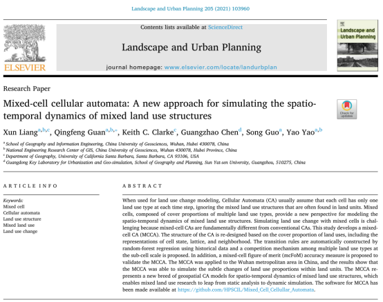 Liang X., Guan Q.*, Clarke KC, Chen G., Guo S., & Yao Y., 2020. Mixed-cell Cellular Automata: A new approach for simulating the spatio-temporal dynamics of mixed land use structures. Landscape and Urban Planning, DOI: https://doi.org/10.1016/j.landurbplan.2020.103960. (IF: 5.441,地理学和城市研究1区, Top期刊)