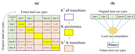 图1. (a)为转化分析策略(TAS)所产生的转化类型矩阵; (b)显示了基于格局分析策略(PAS)的模拟模型中的土地竞争。