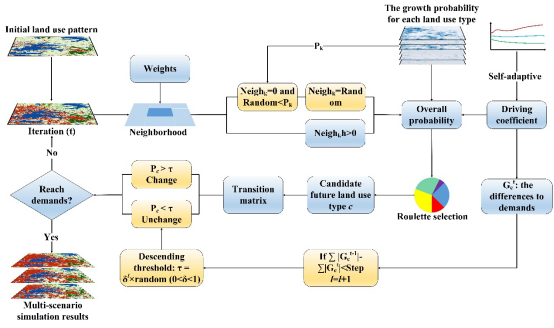 为了模拟多种土地利用类型的斑块演化,本研究采用了基于阈值下降的多类型随机斑块种子机制(图4)。该机制通过使用蒙特卡洛方法,当某类土地利用的邻域效应等于0时,在各土地利用类型的发展概率面(LEAS的输出)上生成变化 "种子"。