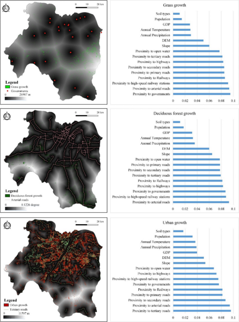图6. 各变量对三种土地利用类型增长的贡献的重要性,最重要的因素与相应的土地利用的扩张叠加图