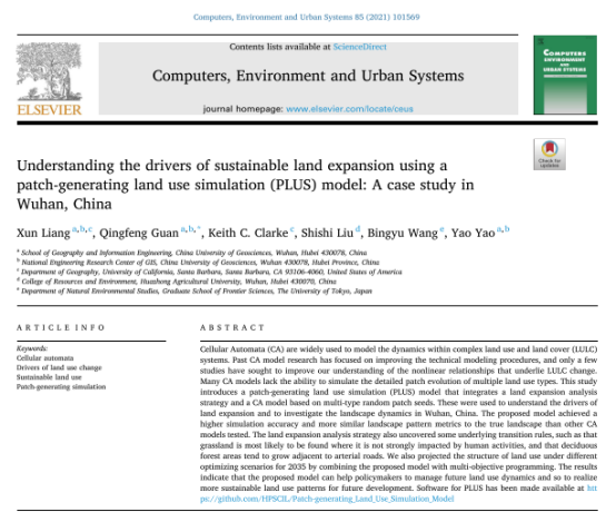 Liang X., Guan Q.*, Clarke KC, Liu S., Wang B., Yao Y., 2021,Understanding the drivers of sustainable land expansion using a patch-generating simulation (PLUS) model: A case study in Wuhan, China, Computers, Environment and Urban Systems, 85, 101569, DOI:10.1016/j.compenvurbsys.2020.101569 (SSCI, IF: 4.655, 地大T1, JCR Q1)