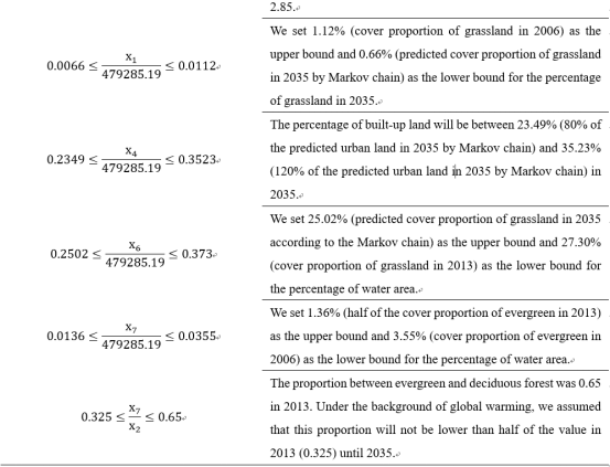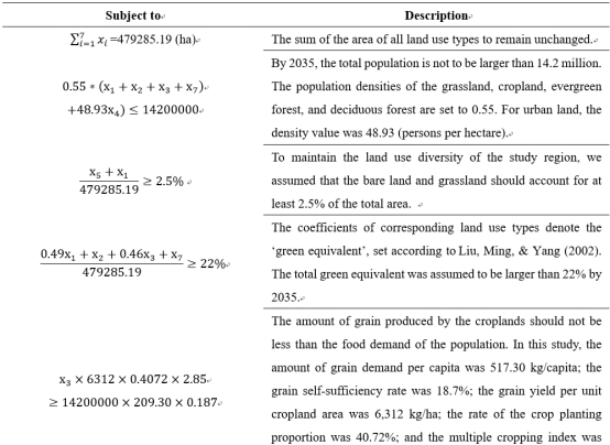 多目标优化(MOP)是一种开放灵活的方法,可以纳入各种生态和宏观经济政策。通过适当定义的目标优化函数和约束条件,可以考虑到规划者的期望(如土地利用多样性)和关注的变量(如粮食需求等)。本研究参考Wang等(2018)提出的目标优化函数、约束条件和参数预设了三个优化目标。(1)经济效益最大化;(2)生态服务价值最大化;(3)生态容量最大化。在我们的研究中,假设最优的可持续土地利用结构同时最大化这三个目标,并据此设计了一个可持续发展(SD)情景。此外,我们还定义了使土地利用的经济效益最大化的经济发展情景(ED)和使土地利用的生态效益最大化的生态保护情景(EP),以更好地比较SD情景下的土地利用模式。MOP的优化目标列于表1中。这些目标函数的约束条件如表2所示。