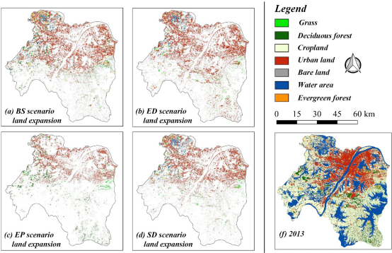 图7. PLUS模型在不同情景下生成的2013-2035年土地扩张图