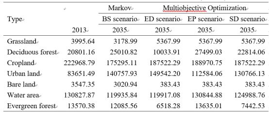 随后,根据优化目标和约束条件,我们利用Lingo 12.0软件对多目标优化问题进行求解。表4为不同情景下2035年土地利用需求预测值。此外,我们通过马尔科夫链得出基准情景(BS),该情景代表了武汉市土地利用变化的历史趋势。我们发现,在ED和SD情景下,耕地的减少量是相同的,但SD情景下水体、常绿林和落叶林的面积更大。这种情况表明,城市扩张如果尽量避免对林地和水域的侵占,可以更好地促进区域更可持续发展。在这些情景中,EP情景的林地、草地、水域面积和耕地最多,而城市用地最少。值得注意的是,BS情景将失去最多的耕地和草地,这表明在当前土地利用变化的趋势下,应更加注意保护耕地和草地。