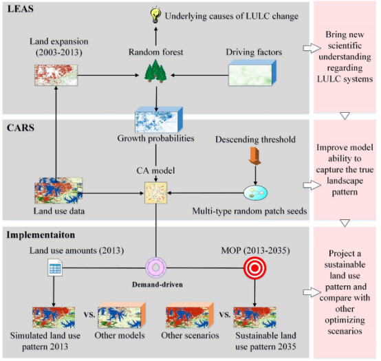 PLUS模型包括两个模块:(1) 基于土地扩张分析策略的转化规则挖掘框架(LEAS); 和(2) 基于多类型随机斑块种子机制的CA模型(CARS)。最后,我们利用多目标优化(MOP)来确定不同情景下的最优土地利用结构。本研究框架结构如图2所示。