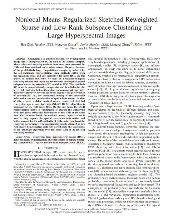 H. Zhai, H. Zhang*, L. Zhang, P. Li (2020). Nonlocal Means Regularized Sketched Reweighted Sparse and Low-Rank Subspace Clustering for Large Hyperspectral Images. IEEE Transactions on Geoscience and Remote Sensing. DOI: 10.1109/TGRS.2020.3023418. (SCI, IF: 5.855, 地大T2, JCR Q1, 中科院大类1区,Top期刊)