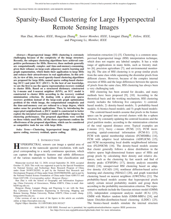 H. Zhai, H. Zhang*, L. Zhang, P. Li (2020). Sparsity-Based Clustering for Large Hyperspectral Remote Sensing Images. IEEE Transactions on Geoscience and Remote Sensing. DOI:10.1109/TGRS.2020.3032427. (SCI, IF: 5.855, 地大T2, JCR Q1, 中科院大类1区,Top期刊)