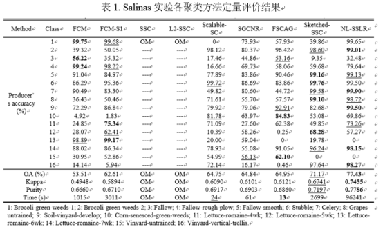 我们选取8种典型的聚类方法作为对比算法,其结果如图4和表1所示。从图4和表1中可以看出,我们提出的NL-SSLR算法在有效降低子空间聚类模型计算复杂度的同时,进一步提高了模型的聚类性能,在子空间聚类方法因内存原因无法正常工作的情况下,在该场景影像上取得了最优的聚类结果,且相较于其他方法,其聚类精度有大幅提高。